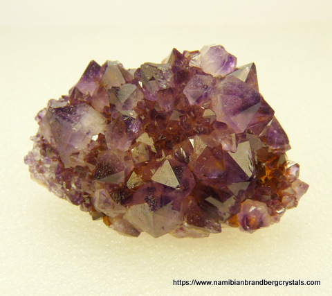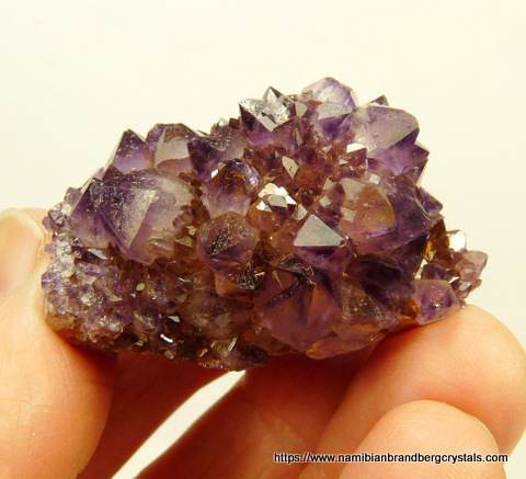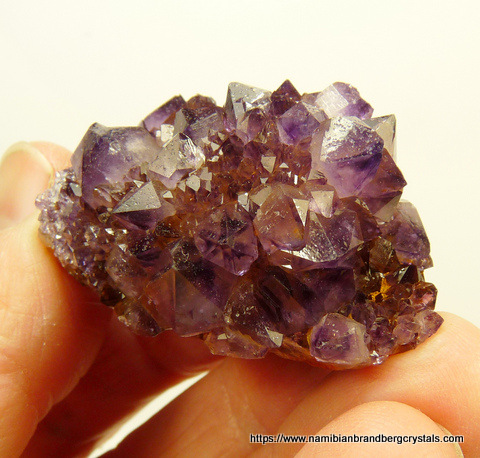 Description: Lovely, dark amethyst quartz crystals with shiny facets, sit on a quartz matrix. The yellowish colour on some sections of the specimen, is iron oxide staining. There are also a few bits of hard clay. Most crystals are in good