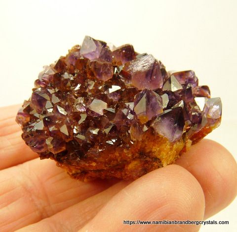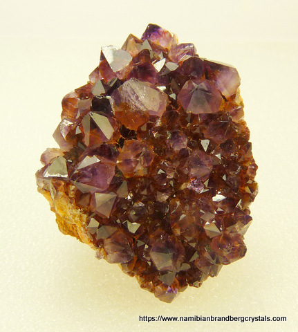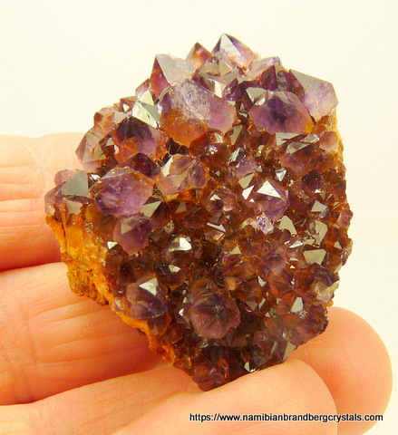 Description: Lovely amethyst quartz crystals with shiny facets, many with darker terminations, sit on a (?)basalt matrix. The yellow colouring to the edges of the specimen is due to iron oxide staining and there are bits of hard clay among the crystals. Some of the crystal have small
