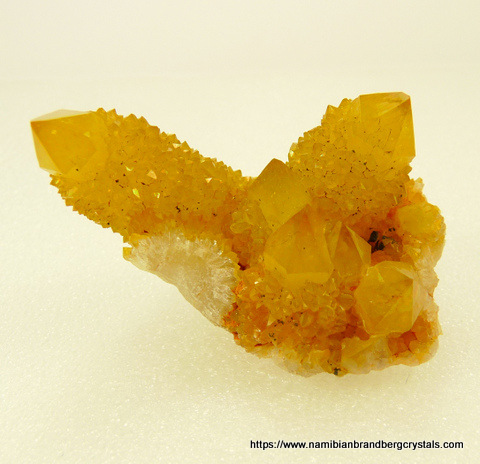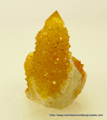Description: Cactus quartz crystals, with a coating of intense yellow iron oxide (commonly called "canary quartz"), sit on a trimmed quartz matrix. The specimen has quite a nice shimmer to it. The only notable damage is to the edges of the specimen. The specimen displays well on a flat surface. Weight