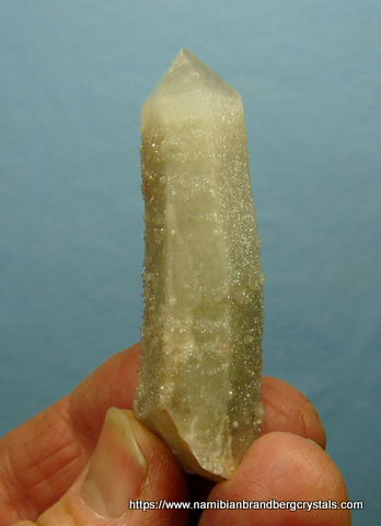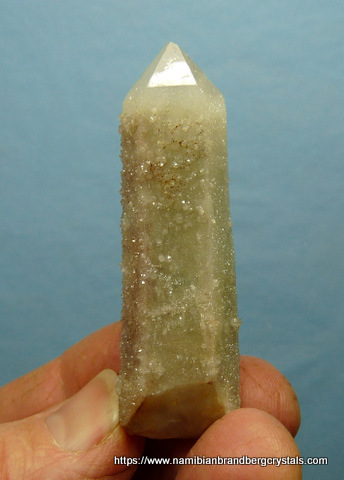 Description: A slightly bent quartz crystal with secondary growth of minute quartz crystals on it. The faint green and reddish colouring is probably due to chlorite and hematite incluusions. There are a few very small nicks to