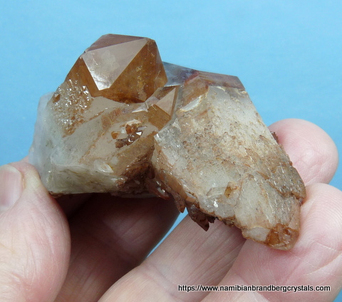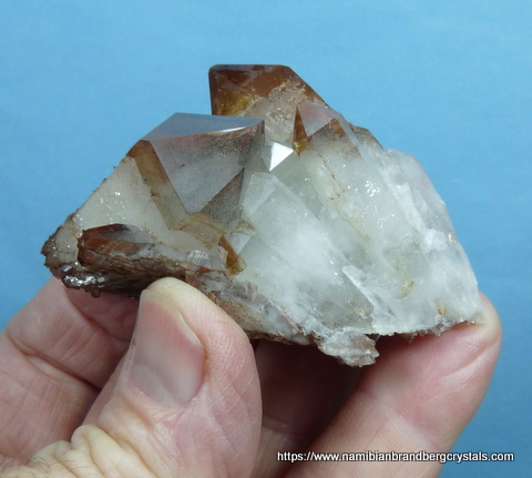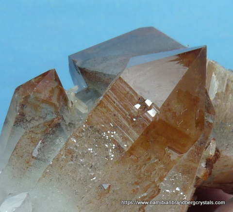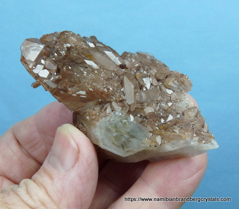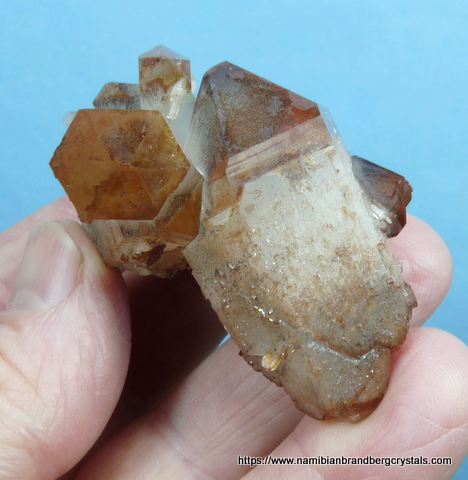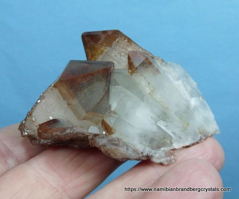 68 x 40 x 30 mm Description: A stunningly beautiful group of phantom quartz crystals with lovely growth patterns, seen especially when turned in light. The colour is due to hematite inclusions. Was it not for a neat pressure mark, this specimen would've been a floater. On the lesser side (amongst the numerous facets) is a minute cube (roughly 2 x 2 mm) which is possibly a pyrite crystal, covered with hematite. The specimen, which displays