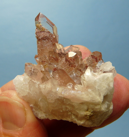 Measurements: 43 x 34 x 28 mm Description: A stunning small cluster of clear quartz crystals with black metallic and reddish-brown hematite phantoms. The terminations appear to be perfect, while the only damage is at the edges of the specimen. Weight of Specimen: 35.5 g Chemical Composition: SiO2 Hardness on Mohs Scale: 7 Location: Orange River Area, Northern Cape, South Africa. Specimen Code: SNCO 015 US $ 45