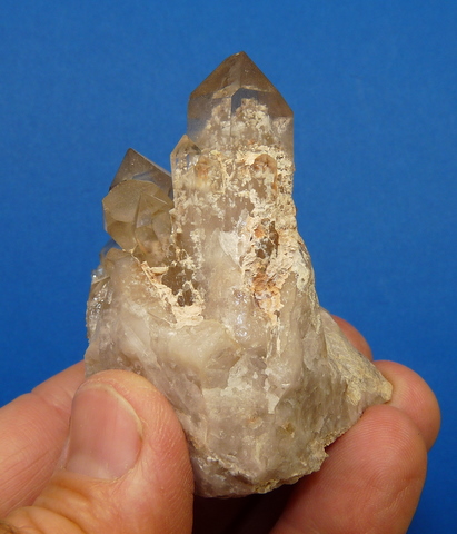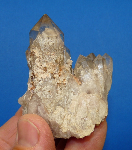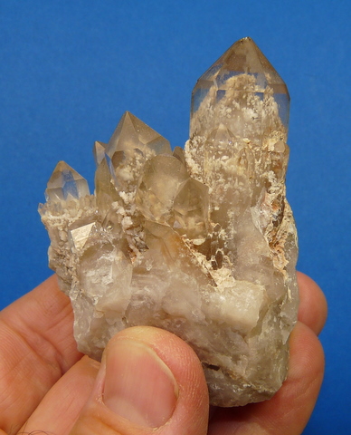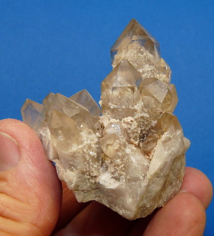Measurements: 66 x 63 x 45 mm Description: A cluster of quartz crystals with phantoms of 1st generation quartz, covered, at best, with towers of white crystals of an unknown mineral. Most terminations have minute to small nicks. Weight of Specimen: 117.4 g Chemical Composition: SiO2 Hardness on Mohs Scale: 7 Location: Orange River area, Northern Cape, South Africa. Specimen Code: SNCO 031 US $ 120 .. .. . . . . . . .