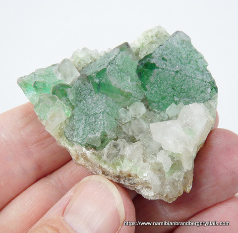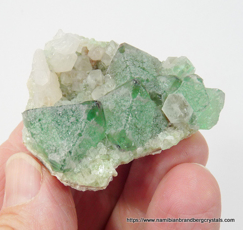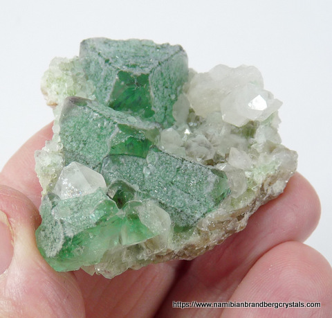 Measurements: 53 x 47 x 16 mm Description: Well-formed, green fluorite crystals with a thin (partial) coating of quartz, share a thin quartz matrix with a few quartz crystals. The terminations have a few small nicks and there is some damage to the edges of the specimen.Weight of Specimen: 43.1 g Chemical