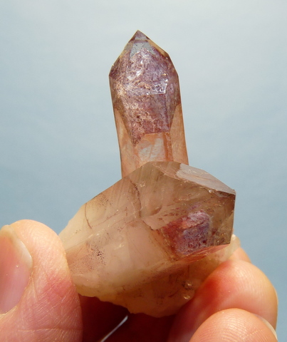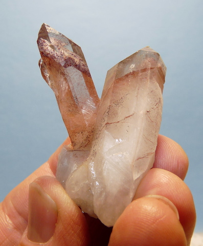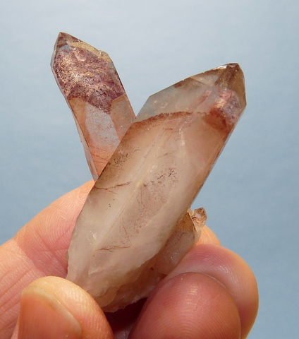 Measurements: 51 x 35 x 26 mm Description: A group of phantom quartz crystals. The phantoms have a coating of reddish-brown hematite with a tinge of purple colouring. The terminations are undamaged. The two larger crystals have pressure and contact marks, and one of them has some damage alongside the pressure mark. Weight of Specimen: 37.3 g Chemical