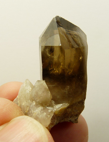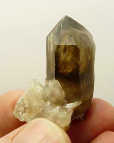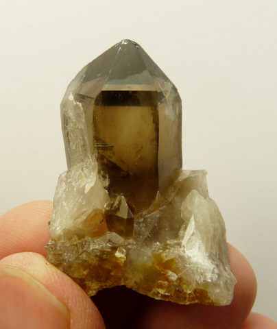 Measurements: 38 x 33 x 28 mm Description: A smoky quartz crystal with bits of cloudy inclusions, sits on pieces of broken quartz crystals. The crystal has a few nicks and pressure marks. This is part of an impressive pocket that was found near Steinkopf, Northern Cape. The specimen displays well on a flat surface, all-round. Weight of Specimen: 23.4 g Chemical Composition: SiO2 Hardness on Mohs Scale: 7 Location: Steinkopf area, Namaqualand, Northern Cape, South Africa. Specimen Code: SNCO 060 US $ 18