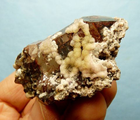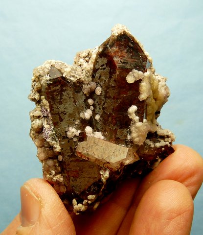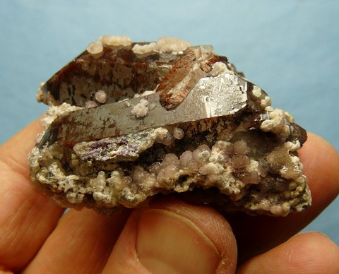 sit on a group of quartz crystals with reddish-brown and black hematite