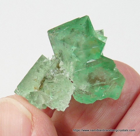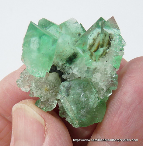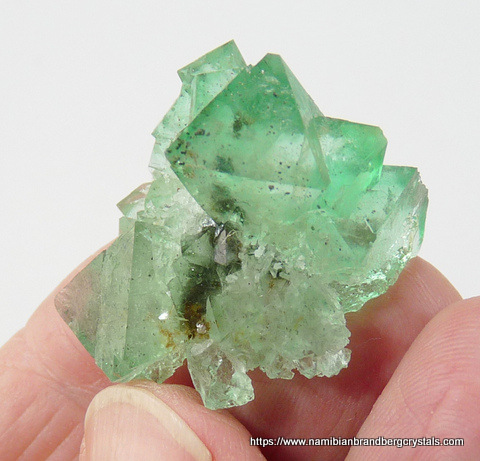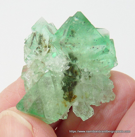 Measurements: 32 x 27 x 20 mm Description: A group of vivid green fluorite crystals with inclusions of minute pyrite bits, and also a darker (to us, unknown) mineral. On some surfaces are bits of quartz. It has good transparency. The specimen has a few small contact marks. It comes from our private collection. Weight of Specimen: 14.1 g Chemical