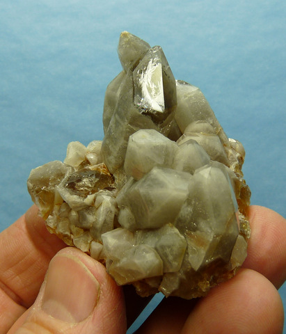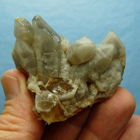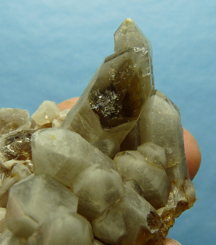 mm Description: A group of smoky quartz crystal with a 2nd generation coating (growth) of white to greyish coloured quartz. Some crystals have three generations of growth. Some terminations have small nicks, while some crystals have broken off. This specimen was part of a large,