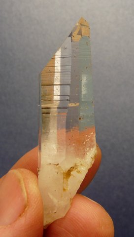 Measurements: 56 x 16 x 13 mm Description: A lovely, gemmy, clear quartz crystal with beautiful growth patterns and fairly big termination facet and small female termination point. Inside