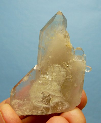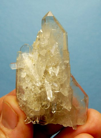Measurements: 58 x 40 x 13 mm Description: This is a most unusual flat group of crystals. It appears to be two main crystals joined back to back with a host of lesser crystals hitching a ride. The specimen is undamaged except at the bottom where it parted from its matrix. Image top right gives a side view of the specimen. Weight of Specimen: 25.5 g Chemical Composition: SiO2 Hardness on Mohs Scale: 7 Location: Vredendal Quarry, Western Cape, South Africa. Specimen Code: SWCV 014 US $ 60 .. .