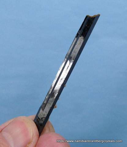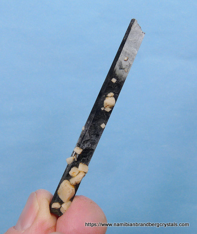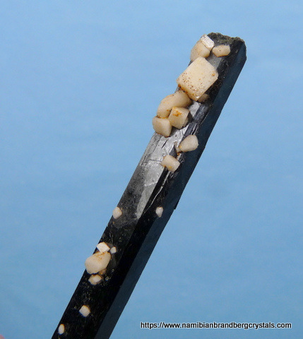 Measurements: 68 x 08 x 07 mm Description: An aegirine crystal with small feldspar crystals on its shiny surface. There is no notable damage. Weight of Specimen: 6.8 g Chemical Composition: NaFe3+(Si2O6) (aegirine) Hardness