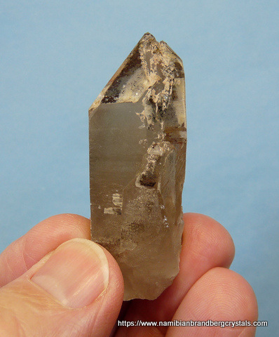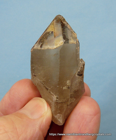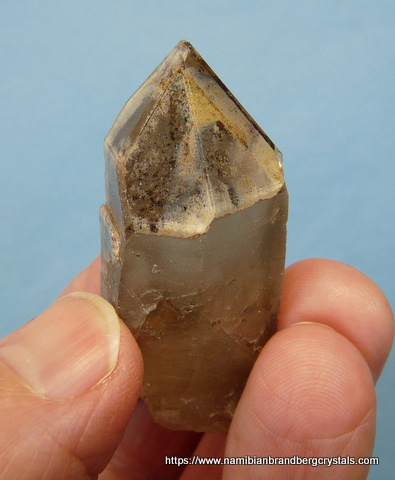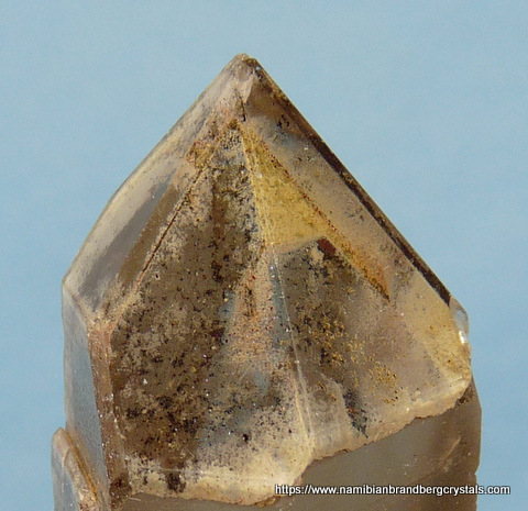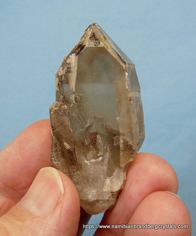 Measurements: 55 x 28 x 20 mm Description: After the quartz crystal had formed, it received a deposit of hematite over the termination. Then at some later stage a layer of secondary quartz growth formed over it, capturing the hematite between the two layers of quartz growth. The termination point has a few very minute nicks, while the rest of the crystal has a flaw and contact / pressure marks. Weight