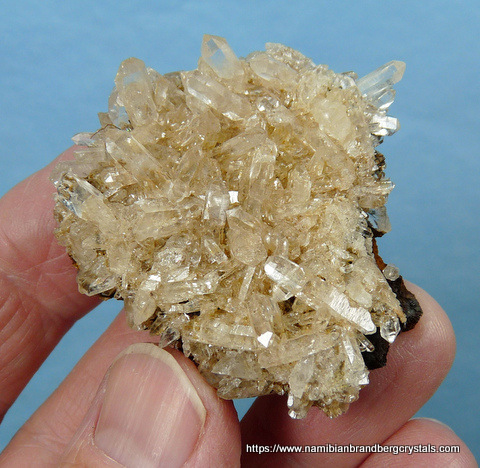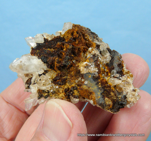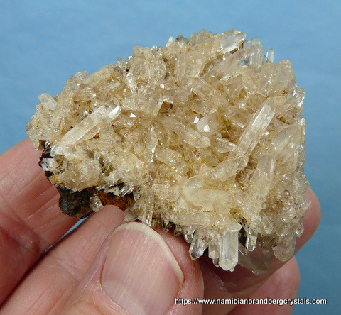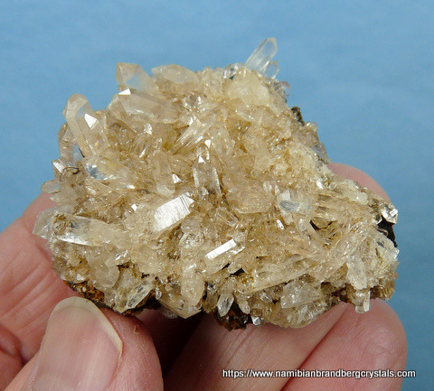 mm Description: A stunning arrangement of clear quartz crystals, with goethite at the bottom of the specimen (image bottom right). There
