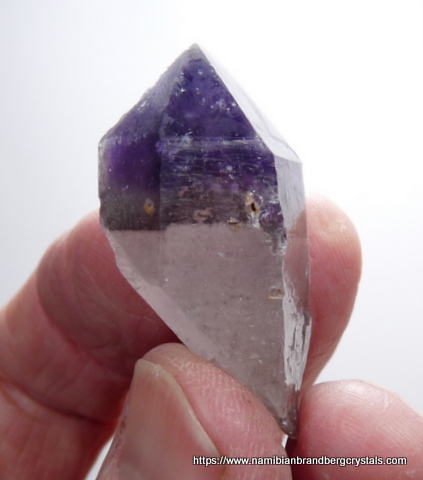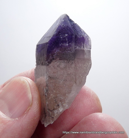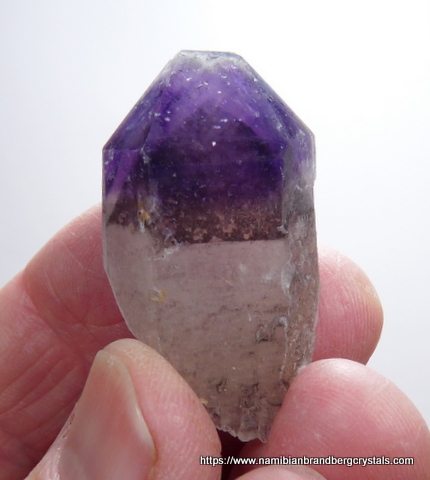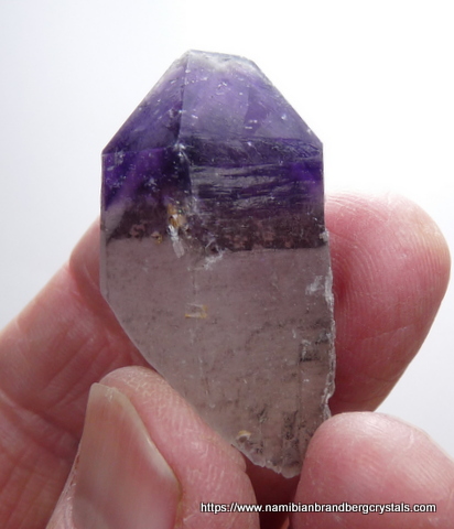 Description: A double terminate amethyst quartz crystal with a phantom, which shows a different colour near the base of the amethyst. At the back of the crystal is an area over the amethyst where the outer layer of smooth quartz is lacking. The main termination point has no damage, but the rest of the specimen has a few nicks. It displays well on a flat surface, all-round. Weight of Specimen: