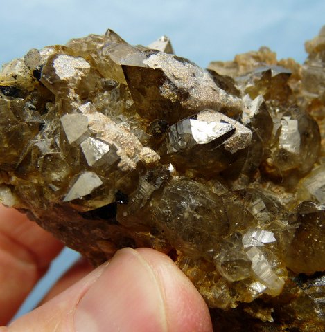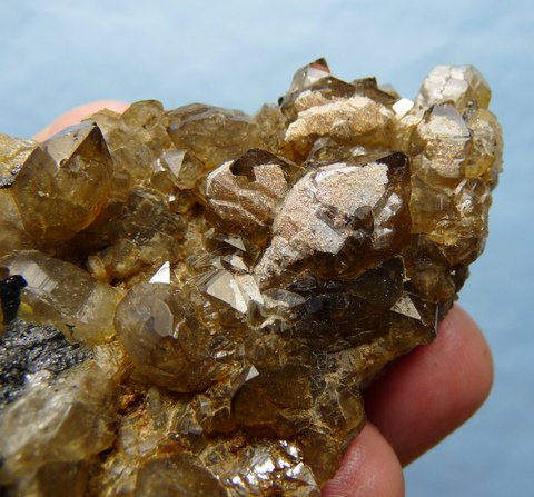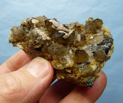 Measurements: 79 x 50 x 32 mm Description: A group of light smoky quartz crystals with some of them having patches of (?)chalcedony / hyalite opal on them, share a matrix of quartz and feldspar with a few pieces of schorl. Many of the crystals have multi-stepped facets. The