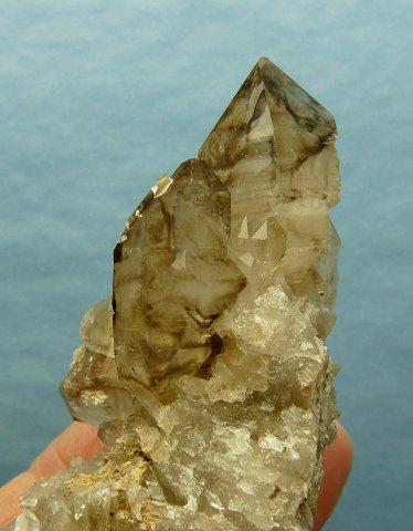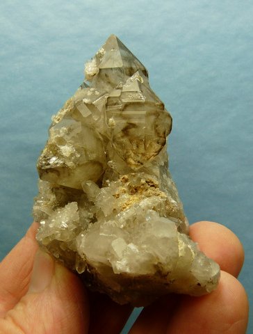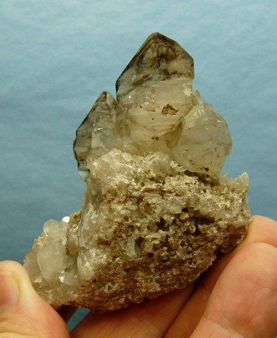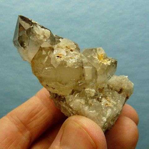 Description: A group of semi-clear quartz crystals, some with patches of smoky colouring. The terminations have small nicks, while the rest of the specimen has a few contact marks and nicks. This specimen comes from a famous,