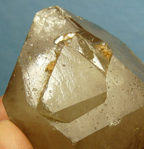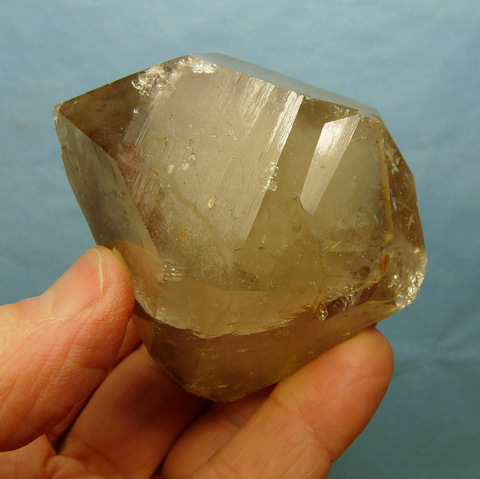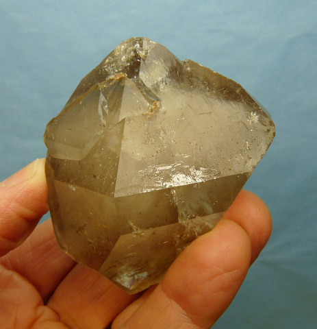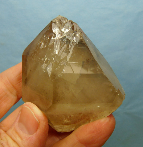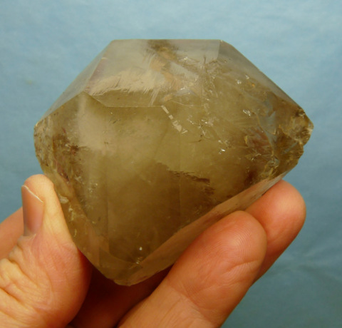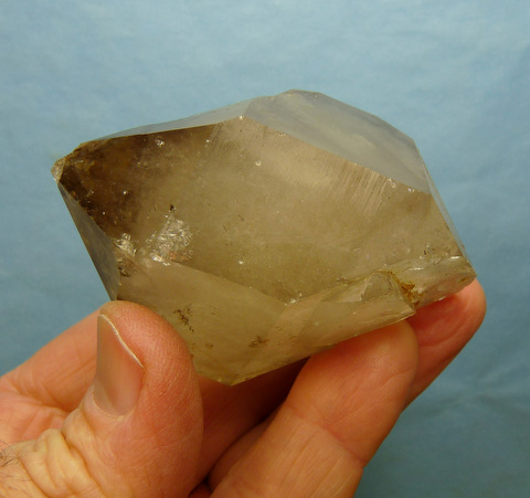 Measurements: 71 x 59 x 46 mm Description: A double terminated quartz crystal with a faint smoky colouring. The centre of the crystal has white clouds, probably caused by thousands of minute air bubbles. One of the termination facets has very interesting growth patterns (image bottom right), and there is a large elevation on one of the others. The specimen has quite a few (mostly small) nicks and a large internal flaw. Weight of Specimen: 193.8 g Chemical Composition: SiO2 Hardness on Mohs Scale: 7 Location: Northern Cape, South Africa. Specimen Code: BARG 054 US $ 38