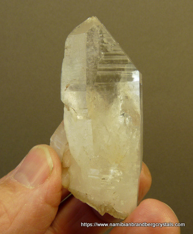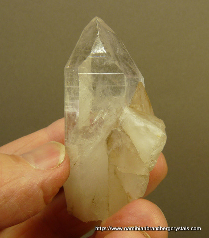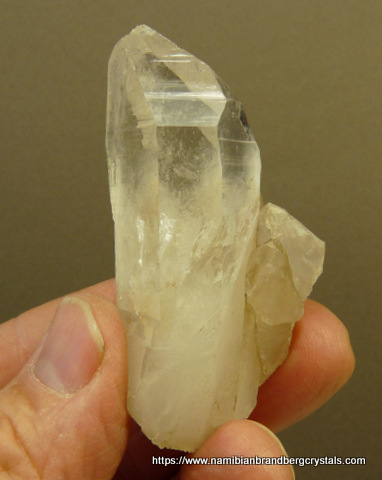 mm Description: A good sized quartz crystal with only a few minute nicks, is accompanied by a few smaller quartz crystals. The specimen, which was mined by ourselves, has a few neat
