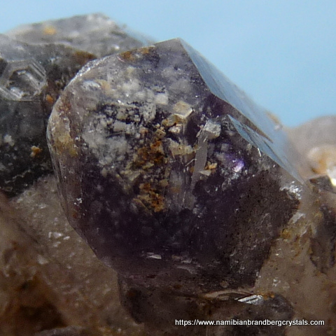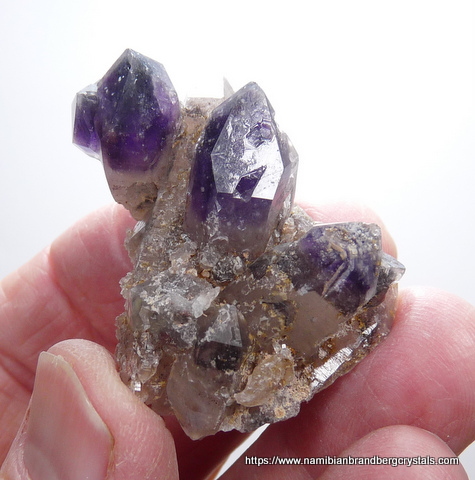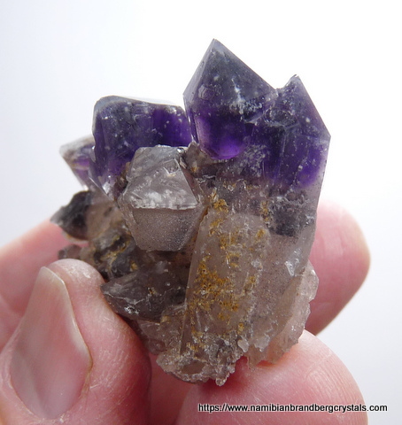 Measurements: 48 x 32 x 26 mm Description: A group of quartz crystals, some with dark amethyst coloured terminations and shallow phantoms. There are bits of feldspar on some surfaces. At least one of the crystals shows grainy whitish and brownish (?)feldspar trapped between the amethyst termination and clear outer layer of quartz. Some of the crystals are just partially covered by the outer (secondary) layer of quartz. The middle crystal has a few indentations where another mineral once sat, and then eroded away over time. A few of the terminations have small nicks. Weight of Specimen: 35.3 g Chemical Composition: SiO2 Hardness on Mohs Scale: 7 Location: Orange River pegmatites, Northern Cape, South Africa. Specimen Code: BARG 077 US $ 15