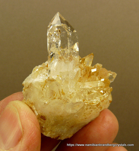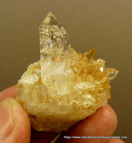 49 x 38 x 25 mm Description: Quartz crystals sit on a quartz matrix with feldspar. The main crystal has lovely gas inclusions. The