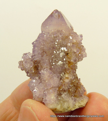 Description: A group of light amethyst cactus quartz crystals share a small quartz matrix. The termination and rest of the