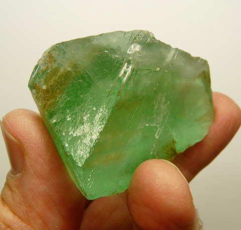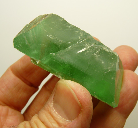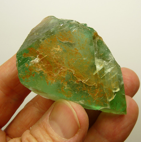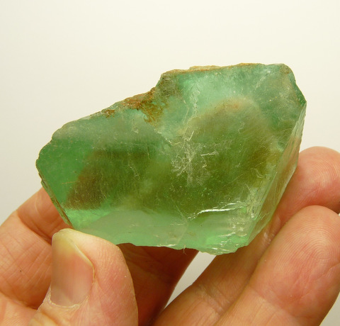 58 x 37 x 23 mm Description: A green fluorite crystal with fairly good transparency, and bits of iron oxide on a part of its surface. It has a few