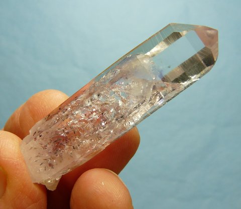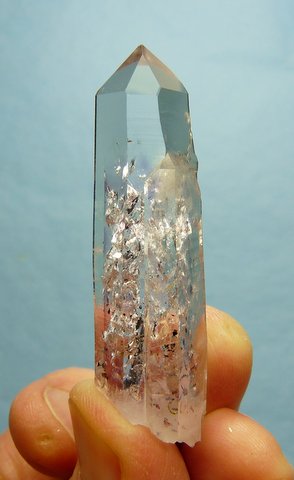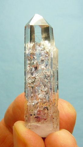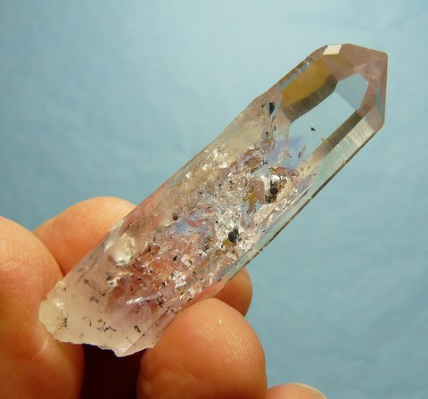 Description: A clear quartz crystal with a faint amethyst colouring, fantastic gas inclusions (some tending to negative crystals), a few very small moving bubbles, a few black and red hematite specks and threads and a lovely rainbow near its base. The crystal has an extra crystal growth on one of its sides. The termination has no