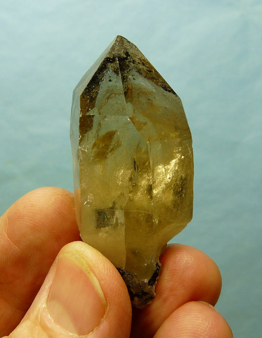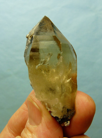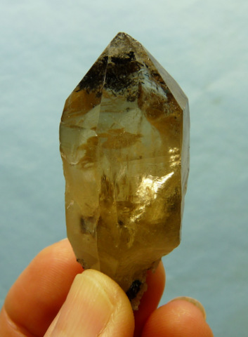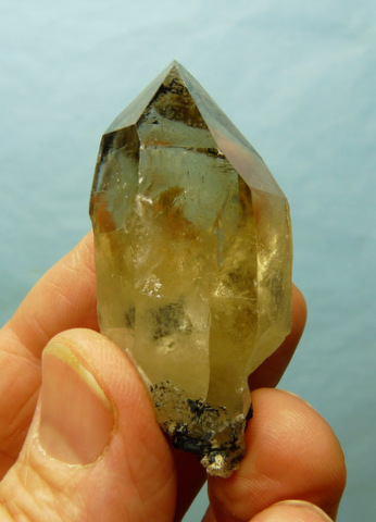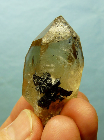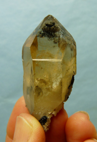 Measurements: 54 x 22 x 21 mm Description: A gemmy, light smoky/citrine quartz crystal with bits of schorl and feldspar to the lower half; small, clear crystals on two termination faces (probably quartz) and minute crystal inclusions of schorl just beneath the same two surfaces. The
