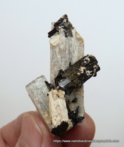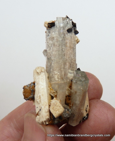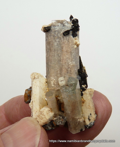 Measurements: 42 x 26 x 25 mm Description: A good combination of aquamarine, schorl and feldspar crystals. It looks like the largest aquamarine crystal has actually formed around a feldspar crystal to some extent, and has schorl crystals sitting in and across its termination. The terminations of the aquamarine crystals have fairly good clarity. The specimen has no notable damage. Weight of Specimen: 20.3 g Chemical