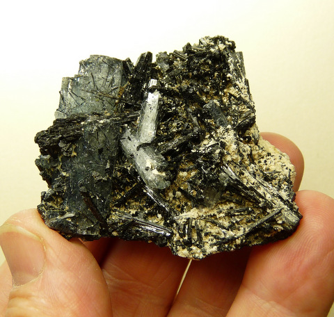 Measurements: 60 x 58 x 22 mm Description: A group of schorl and light blue aquamarine crystals, most of which have schorl crystal inclusions. Some sections of the specimen has feldspar on it. The aquamarine crystals have
