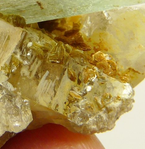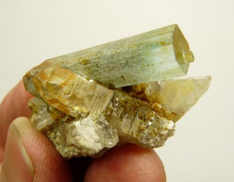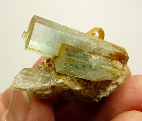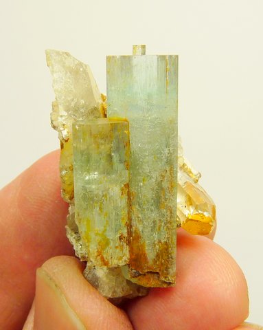 22 mm Description: Two aquamarine crystals fused together (32 x 14 x 08 mm), with one of the terminations having a peculiar, small aquamarine crystal sitting on it. The aquamarine crystals sit on a matrix of damaged quartz crystals, a well-shaped quartz crystal and several tiny muscovite crystals (image top right). The aquamarine crystals have a thin coating of iron oxide in and just beneath their surfaces. The only damage to the aquamarine crystals, is at the base. The quartz crystal has a few small nicks. Weight of Specimen: 15.7 gChemical