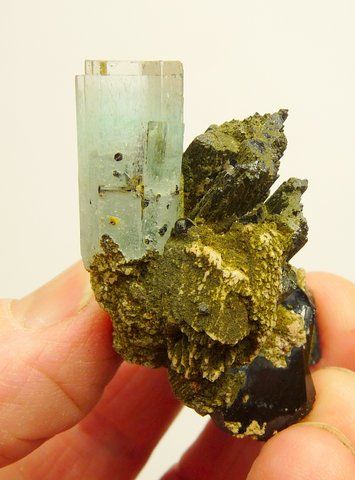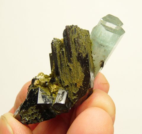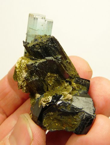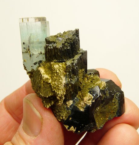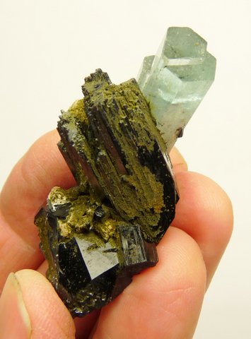 Measurements: 41 x 40 x 32 mm Description: A light blue aquamarine crystal (34 x 11 x 10 mm) with an interesting 'stepped', gemmy termination, sits on schorl crystals (variety foitite) and some feldspar which have a partial coating of very minute, greenish / yellowish crystals of a (to us, unknown) mineral. The