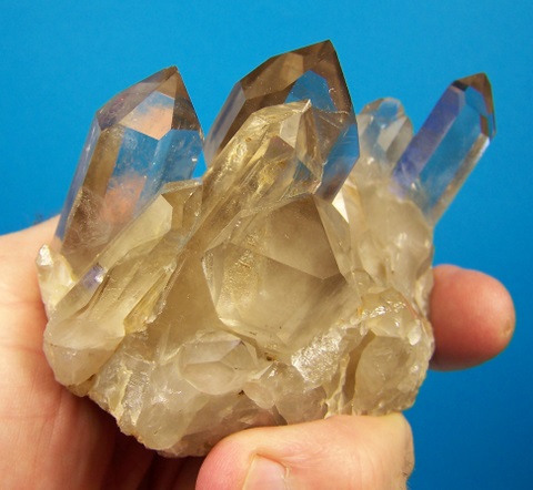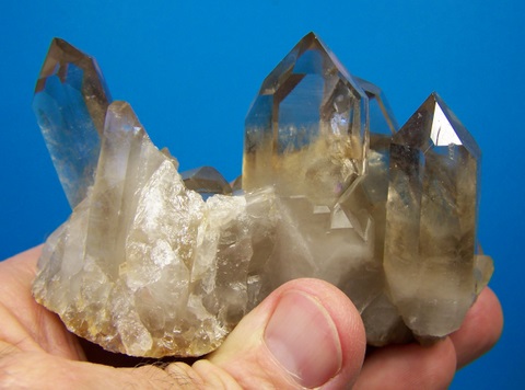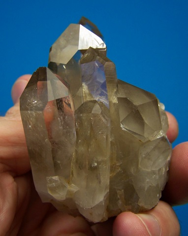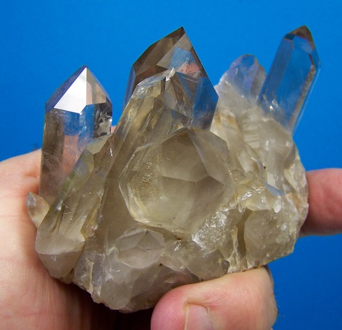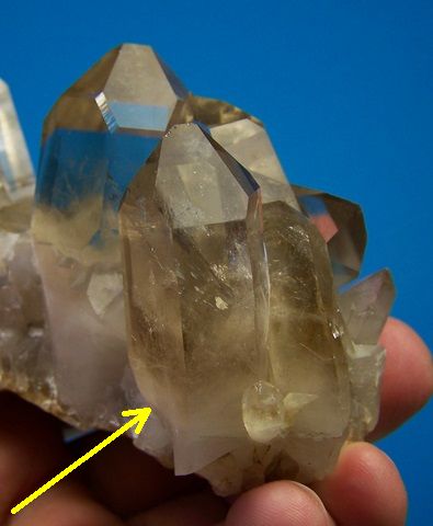 Measurements: 94 x 64 x 48 mm Description: A beautiful group of light smoky quartz crystals. The main crystals have only very small nicks, while there is damage to the edges of the specimen where it parted from other minerals. The specimen has been repaired (a crystal on the end, that came loose, has been mended - see photograph on right with yellow arrow). The repair was done so well, that it can only be noticed by an expert. Weight of Specimen: 285.4 g Chemical Composition: SiO2 Hardness on Mohs Scale: 7 Location: Orange River, Northern Cape, South Africa. Specimen Code: SNCO 004 US $ 120