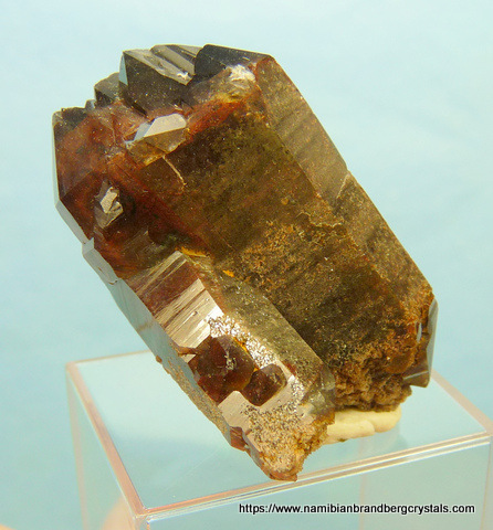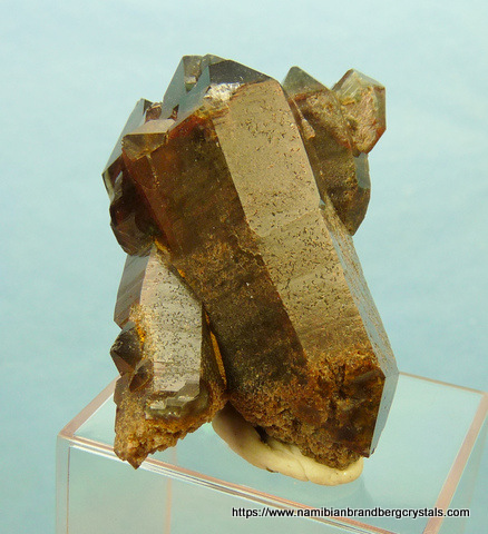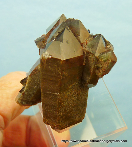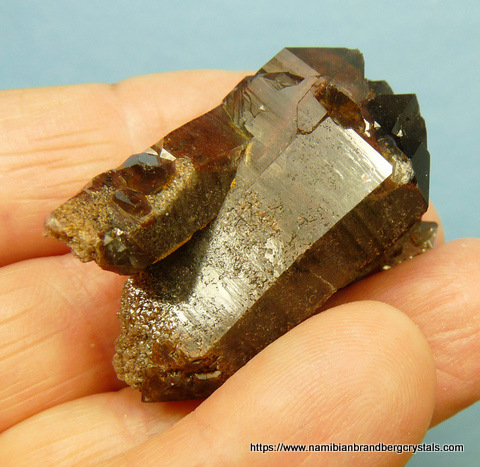 Measurements: 43 x 33 x 28 mm Description: A group of quartz crystals with dark hematite inclusions and multiple terminations. Some terminations have small nicks. Weight of Specimen: 34.2 g Chemical Composition: SiO2 Hardness on Mohs Scale: 7 Location: Orange River Area, Northern Cape, South Africa. Specimen Code: SNCO 062 US $ 45 . . .