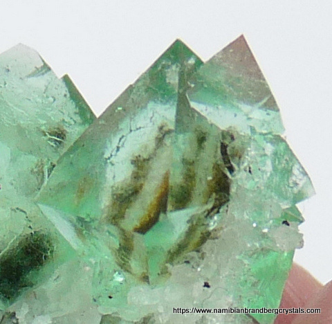Measurements: 32 x 27 x 20 mm Description: A group of vivid green fluorite crystals with inclusions of minute pyrite bits, and also a darker (to us, unknown) mineral. On some surfaces are bits of quartz. It has good transparency. The specimen has a few small contact marks. It comes from our private collection. Weight of Specimen: 14.1 g Chemical
