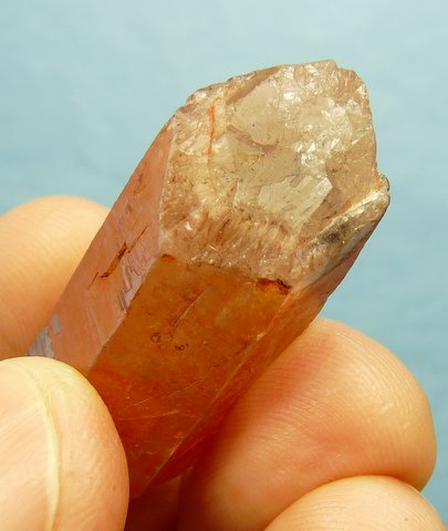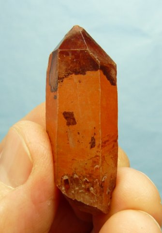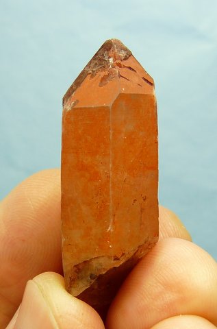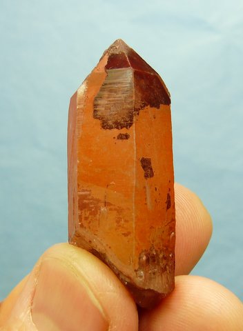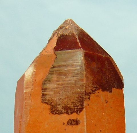 x 16 x 15 mm Description: The crystal underwent at least three generations of quartz growth, starting with a pale smoky quartz growth. This was covered by iron oxide and then followed by a partial quartz growth. Around the base are numerous tiny, flat quartz crystals, that possibly grew in a further stage of development. Large parts of the crystal surface has the iron oxide exposed. It is interesting to note that the pieces where the iron oxide is covered by quartz, are darker than the exposed areas. The lower end has some facets (bottom left image). The termination has a contact mark,