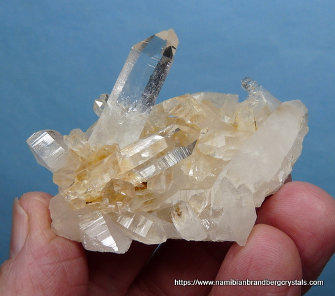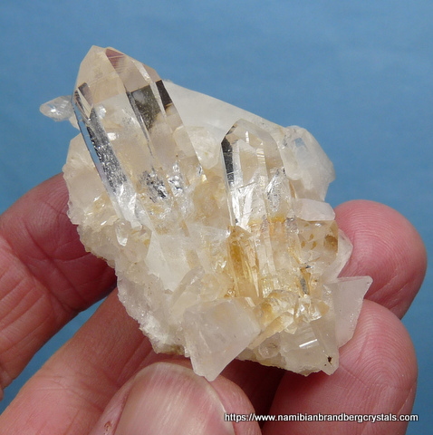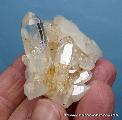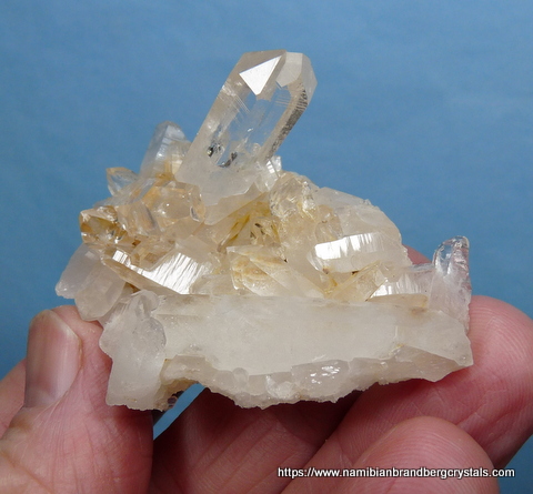 Description: A stunning group of quartz crystals that displays well on a flat surface, all-round. Some iron oxide has been captured among the base of some crystals. The only notable damage is to some of the edges of the specimen. Weight of Specimen: 38.8 g Chemical Composition:
