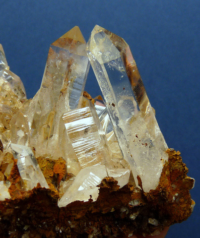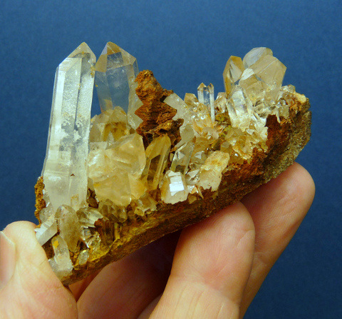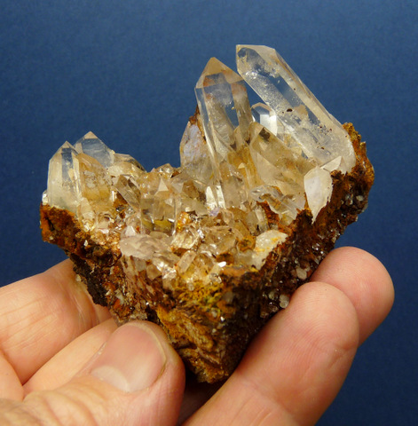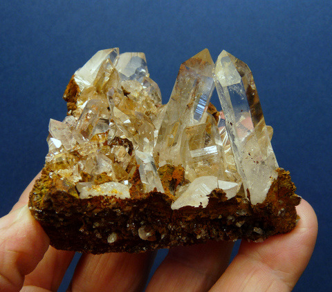 mm Description: Gemmy, clear quartz crystals with bits of goethite, sit on a sandstone matrix. Most crystal terminations have no damage, while one has a long, thin (not very obvious) nick. The base has been trimmed at the bottom, for better display. The matrix has a few stable flaws. Weight of Specimen: 147.9 gChemical Composition: