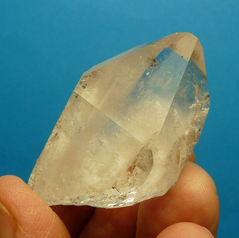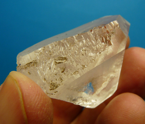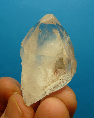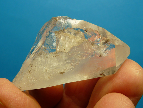 Measurements: 49 x 28 x 21 mm Description: A stubby quartz crystal floater with a patch of milkiness and lovely growth patterns in three areas where recrystallization has occurred. No noteworthy damage. Weight of Specimen: 33.9 g Chemical Composition:
