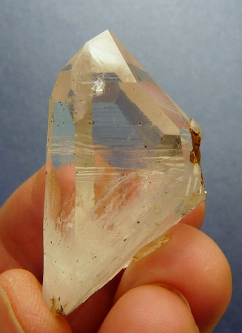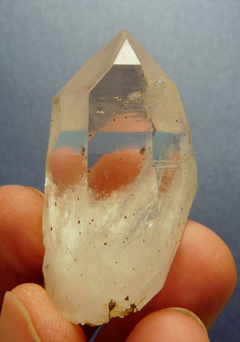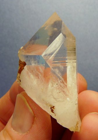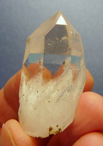Description: A clear quartz crystal with lovely growth patterns and termination facets. The bottom has re-crystallized, and a minute (6½ mm long) crystal is attached near the centre of it. Inside the