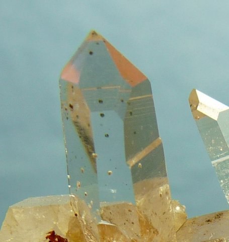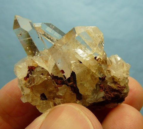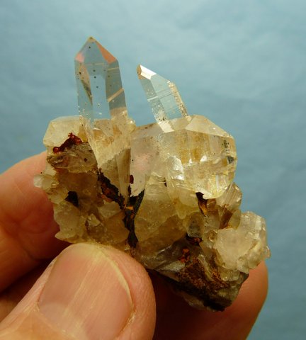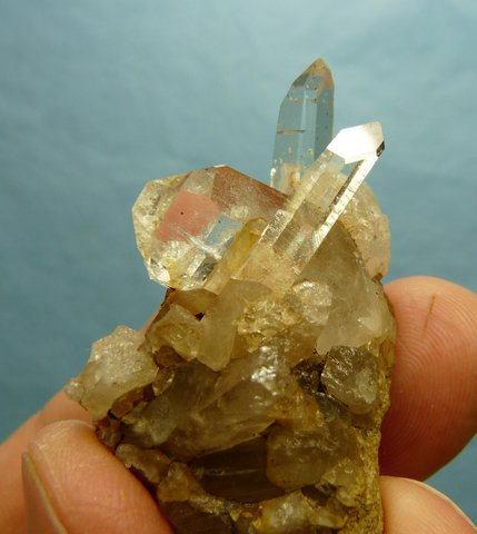 Measurements: 53 x 31 x 28 mm Description: A few clear quartz crystals sit on a matrix of broken quartz crystals and rock and bits of (?)goethite. The crystals have a few minute balls of chlorite inside, and a few brownish indentations on the surface, where chlorite balls were probably long ago, and then eroded away, and eventually replaced by (?)goethite. A smaller crystal has partially penetrated the stubby crystal. Please follow this link to see what these minute balls look like under a microscope. Two of the crystals each has a flaw, and there is a long nick to the lower side of one of the crystals, but the termination points appear to be in good shape. Weight of Specimen: 29.1 g Chemical