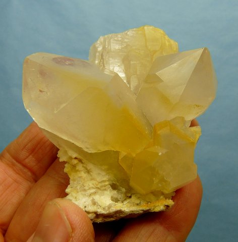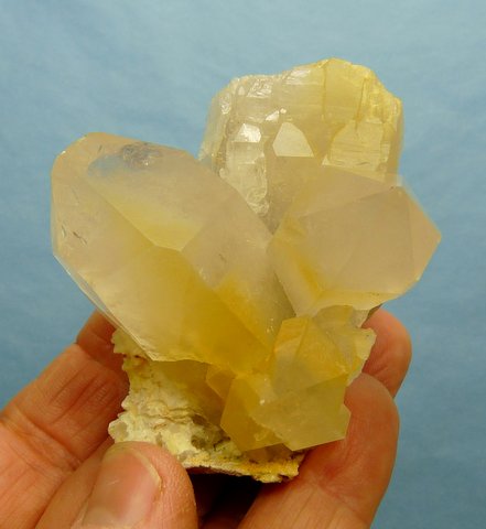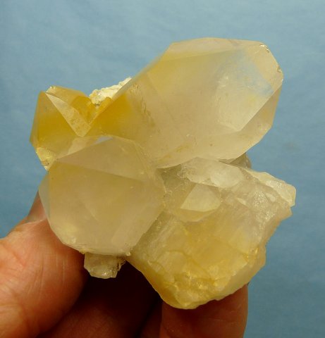 Measurements: 71 x 57 x 33 mm Description: A group of milky to clear quartz crystals with some parts having a thin coating of yellow iron oxide. One side of the specimen has bits of feldspar attached and there are a few copper coloured rutile needles at the bottom. Two of the
