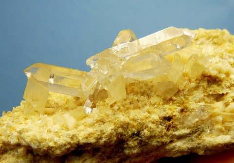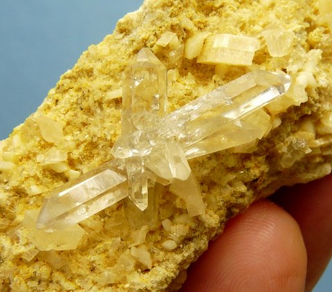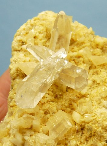 Measurements: 72 x 35 x 30 mm Description: A delicate clear crystal cluster (31 x 16 mm) on a bed of small dolomite and feldspar crystals. One of the main crystal terminations rests on a dolomite crystal. The matrix consists of soft sedimentary rock. One of the terminations has a few small nicks. Weight of Specimen: 75 g Chemical