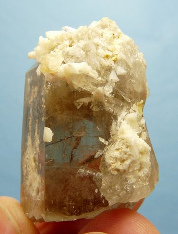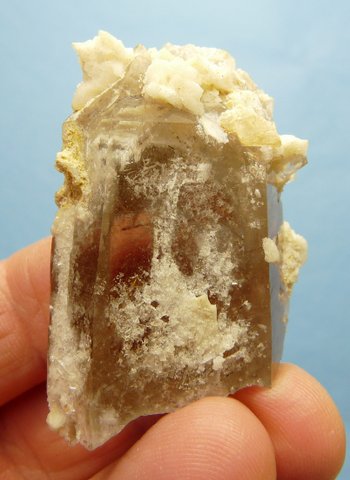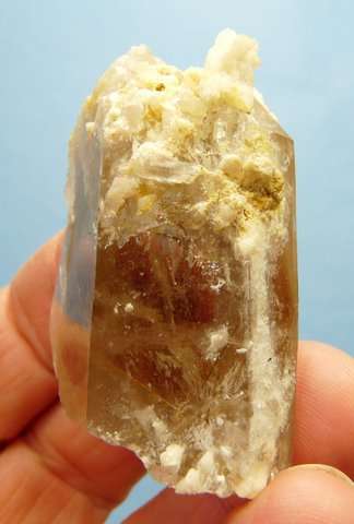 Measurements: 48 x 35 x 24 mm Description: A light smoky quartz crystal plays host to numerous bits of feldspar, dolomite and minute quartz crystals, some of which are partially embedded in it. It also has several lovely copper coloured rutile needles. Several small rainbows can be seen when tilted in light. The bottom of the specimen has re-crystallized. The specimen displays well on a flat surface, in an upright position. The specimen has a few flaws and a contact mark. Weight of Specimen: 57.4 g Chemical