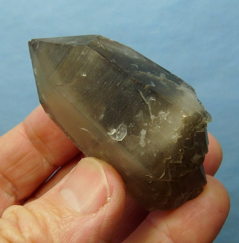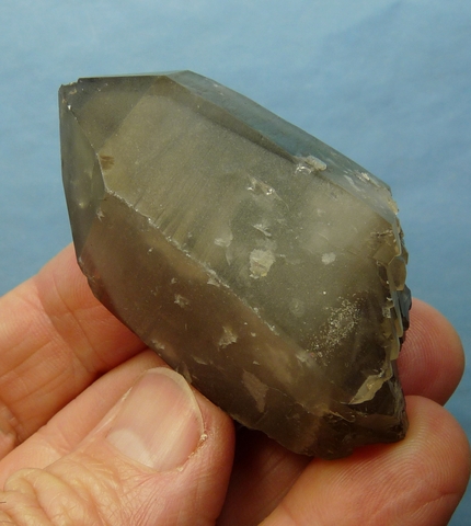 36 x 28 mm Description: A double terminated quartz crystal with smoky colouring and phantom. The greyish-blue inclusions are possibly chlorite. One of the terminations is multi-terminated. The specimen has a few nicks