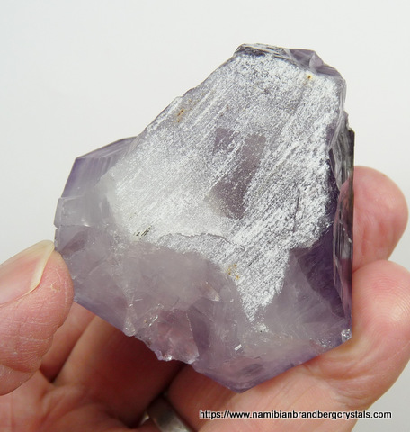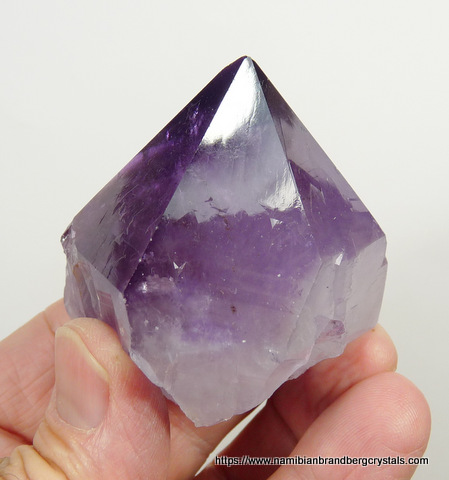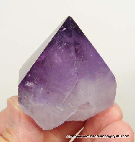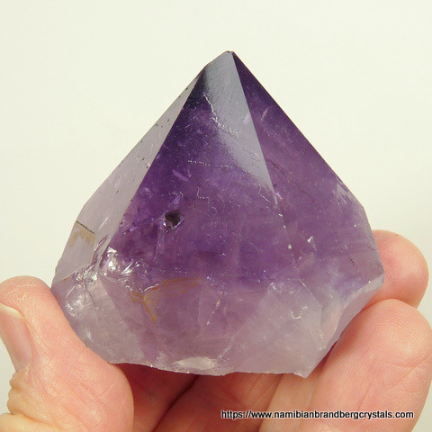 mm Description: A stubby amethyst quartz crystal. When viewed in light, a small rainbow can be seen near the centre. The termination point has a very small nick. There is a nick to one edge and contact / pressure marks near the crystal's base. The base been trimmed for better display (image bottom right) - it displays well on a flat surface. When displaying your amethyst specimens, keep in mind that the colour tends to fade when exposed to sunlight. Weight of